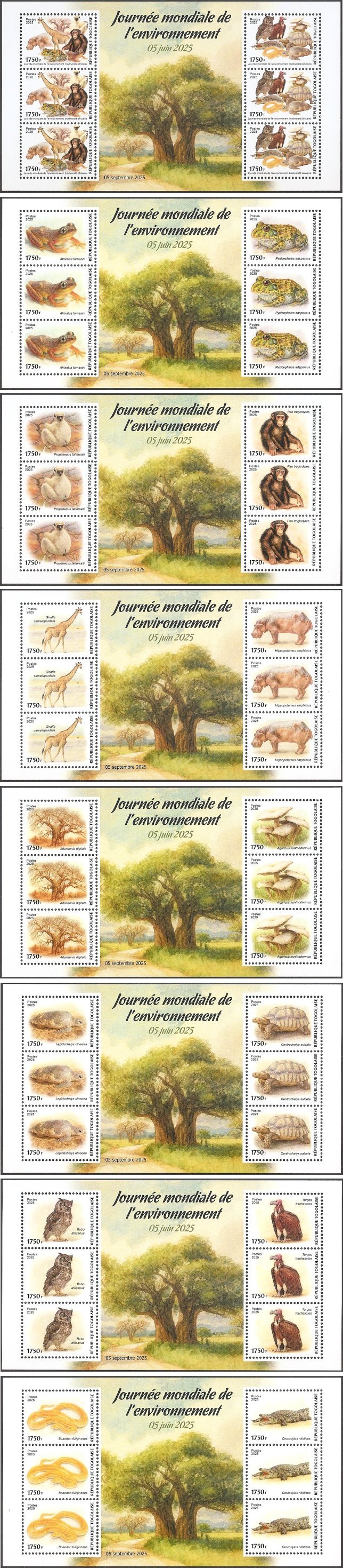 La grenouille africaine rayée (Afrixalus formasini) et le crapaud buffle africain (Pyxicephalus adspersus) se retrouvent ensemble sur le deuxième feuillet. Ils sont également réunis sur le premier timbre du premier feuillet, avec une assemblée d'animaux.
