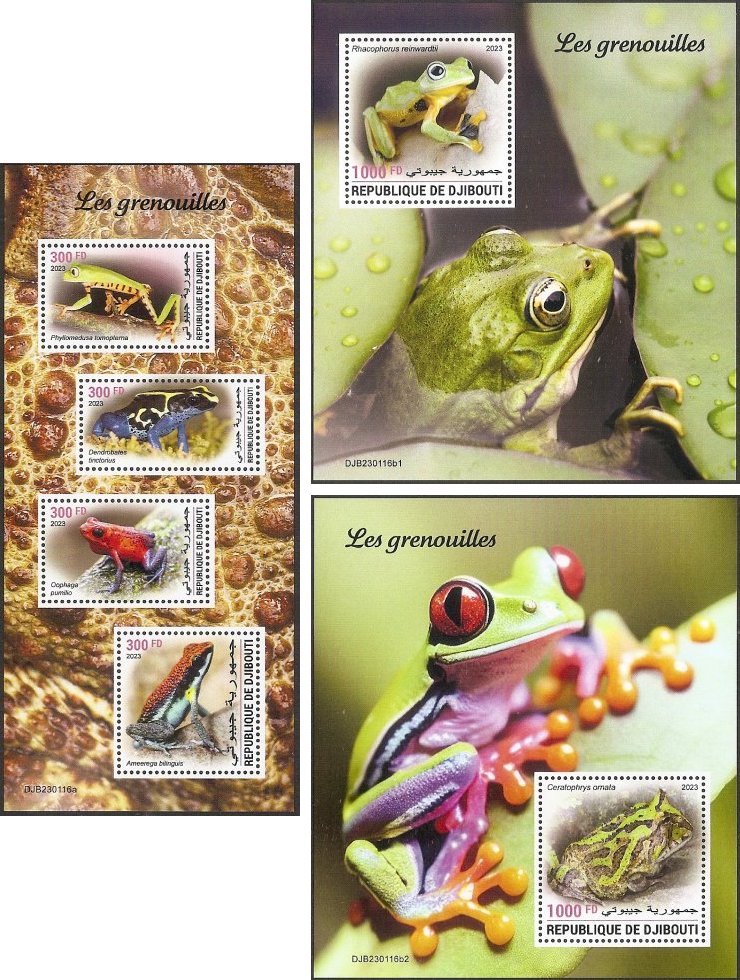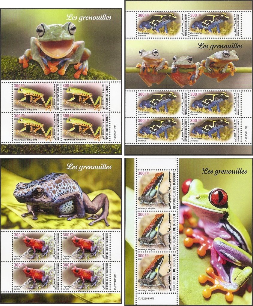 Feuillet: une phyloméduse tigrine (Callimedusa tomopterna, Phyllomedusa tomopterna sur le timbre), un dendrobate à tapirer (Dendrobates tinctorius), un dendrobate fraise (Oophaga pumilio) et Ameerega bilinguis.
