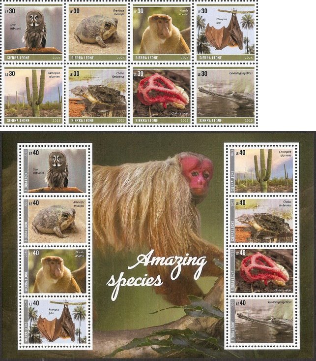 Les 4 amphibiens représentés par cette série sont: une grenouille de Karpathos (Pelophylax cerigensis), une grenouille de Darwin du Sud (Rhinoderma darwinii), Leptophryne cruentata et un axolotl (Ambystoma mexicanum).